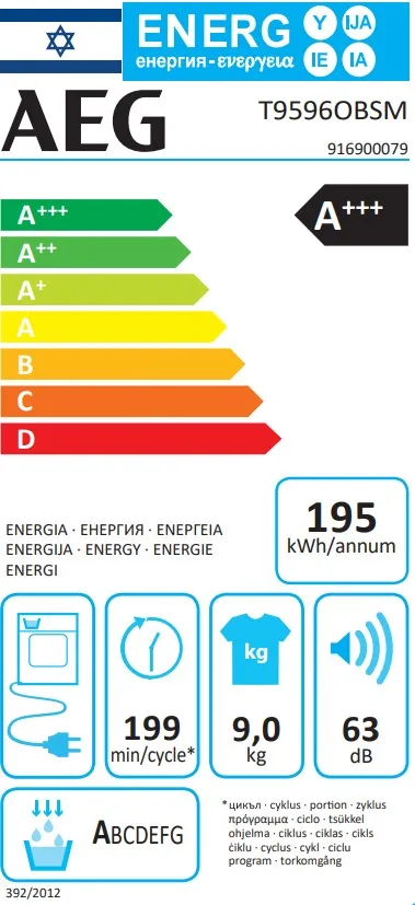מייבש כביסה 9 ק"ג Heat Pump Inverter דגם AEG T9596OBSM