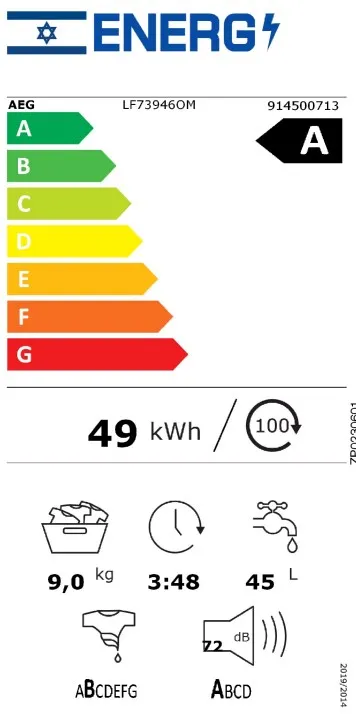 קיבולת עד 9 ק"ג – סחיטה עד 1400 סל"ד , דירוג אנרגטי : A