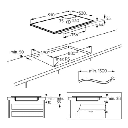 דרוש מרווח מינימלי לאוורור של 2 ס"מ מתחת לכיריים